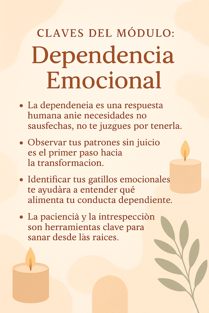 Exploramos cómo reconocer y aceptar nuestra sombra, perdonarnos, y abrirnos a la posibilidad real de cambio. Hablamos sobre la importancia de la humildad, la bondad hacia uno mismo y la honestidad, así como de los valores fundamentales que sostienen el proceso de recuperación y crecimiento personal. Aprenderás a identificar las raíces de la dependencia emocional, a trabajar con tus creencias limitantes y a cultivar rutinas de autocuidado esenciales: sueño, alimentación consciente, ejercicio físico y meditación123.